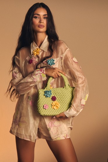 Set de camisa y short en tejido tipo seda bordada, con flores de resina aplicadas, ligero y especial.